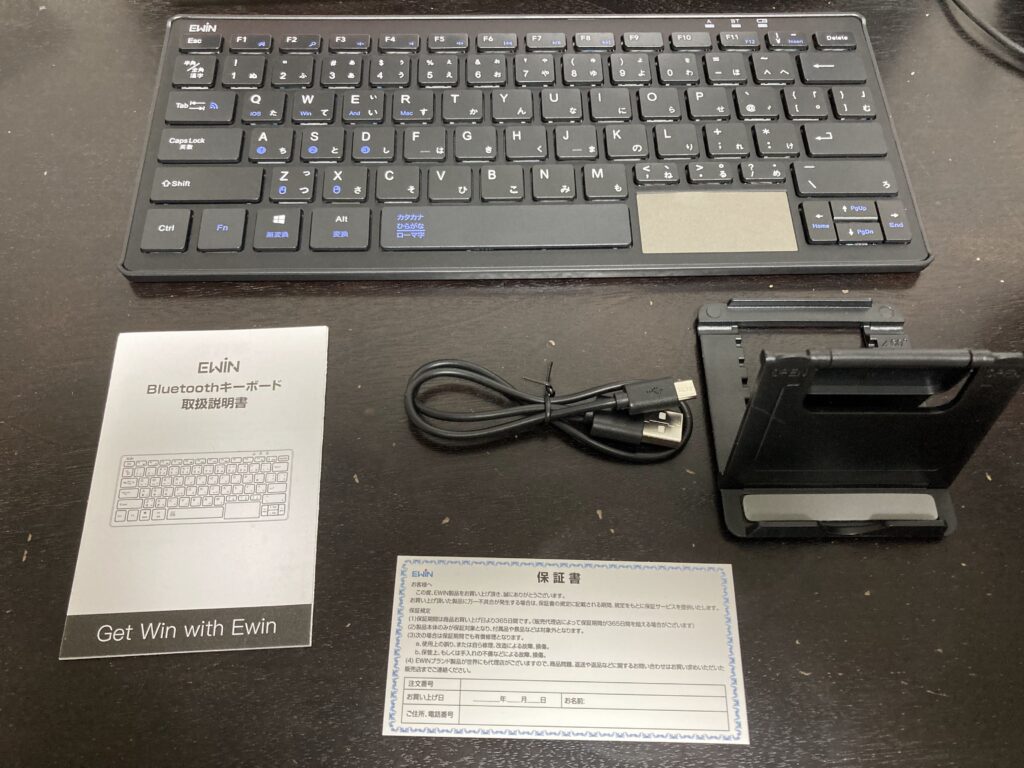 キーボード本体と充電用のmicro USB-TypeBケーブル、説明書、保証書、およびスマホ/タブレット用スタンドが入っています。充電式なのは電池を買いに行かなくてすむので個人的にはありがたいです。
