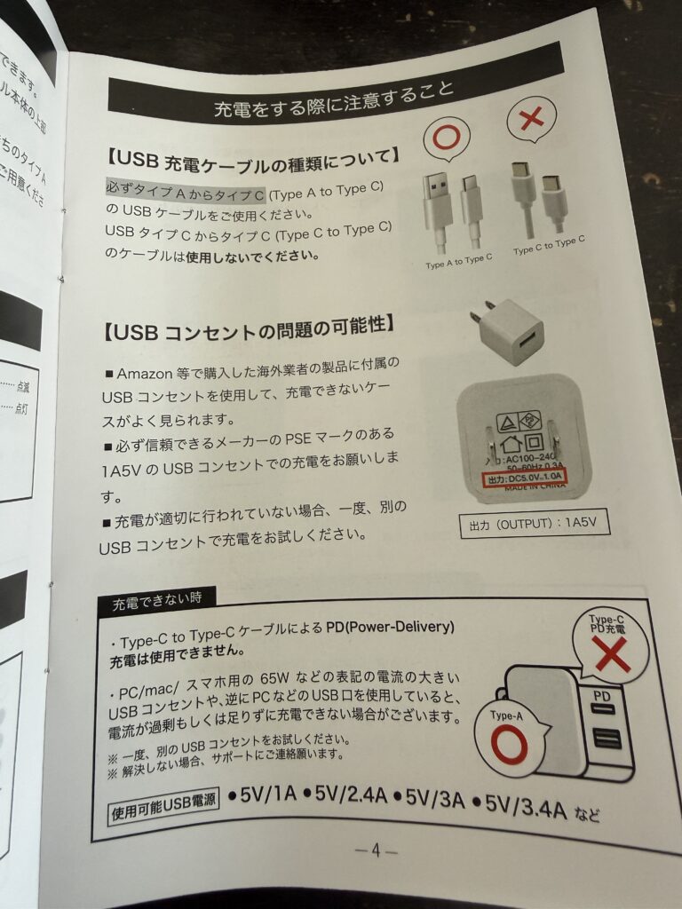 また、充電についてはUSB-Cの口がついていますが、CtoCのケーブルからは電圧の関係なのか充電ができないようです。