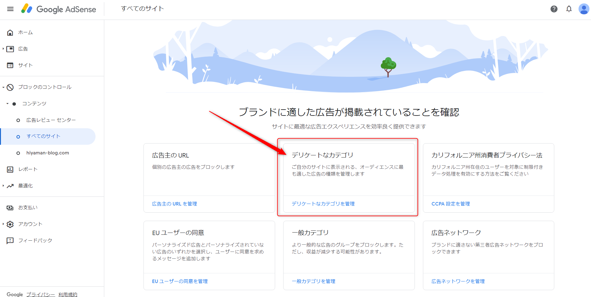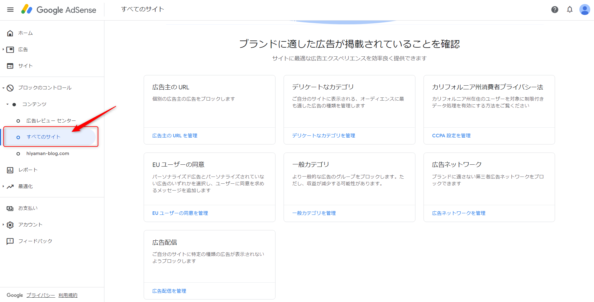 Google AdSenseにログインすると表示されるダッシュボードの左側にあるサイドバーからブロックのコントロールを選択する。