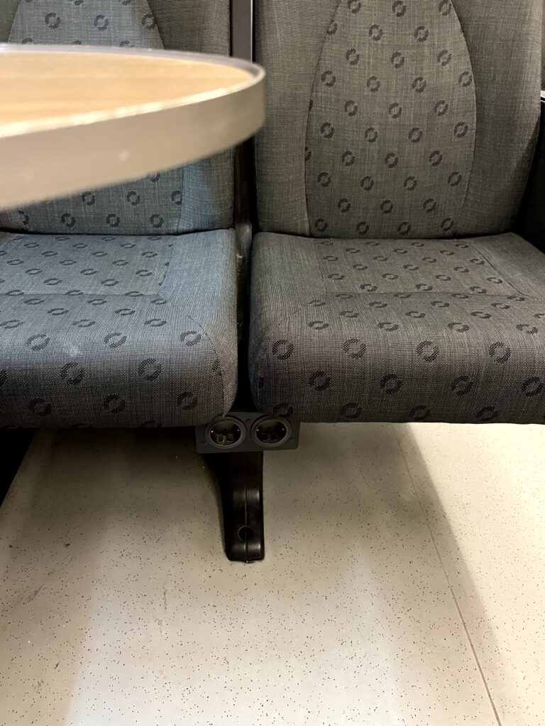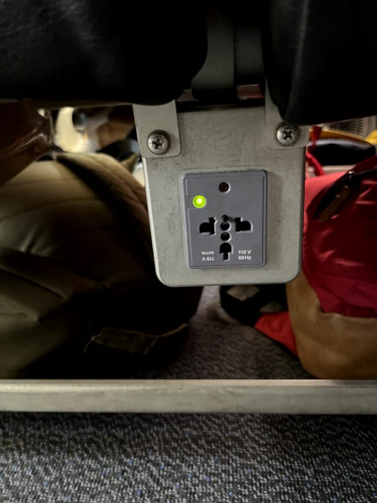 シート下には電源ソケットがあり、これは助かるユニバーサルタイプでした。
