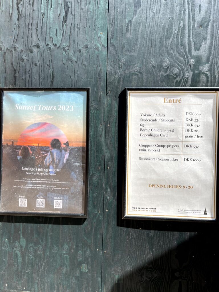 入場料は無料ですが、あの特徴的な塔に登る場合は69DKKです。