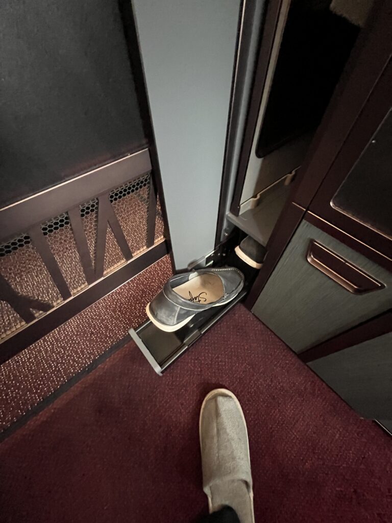 ビジネスクラスにもついていましたし、HND-SYD線のファーストクラスにもついていたのでやはりJALは靴の収納に関して並々ならぬ想いがあるようです。