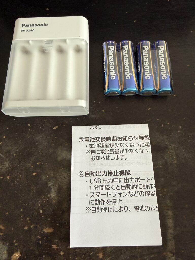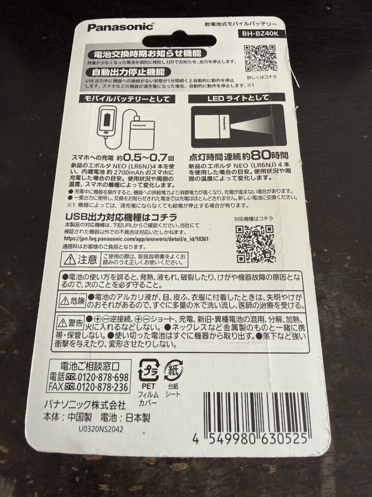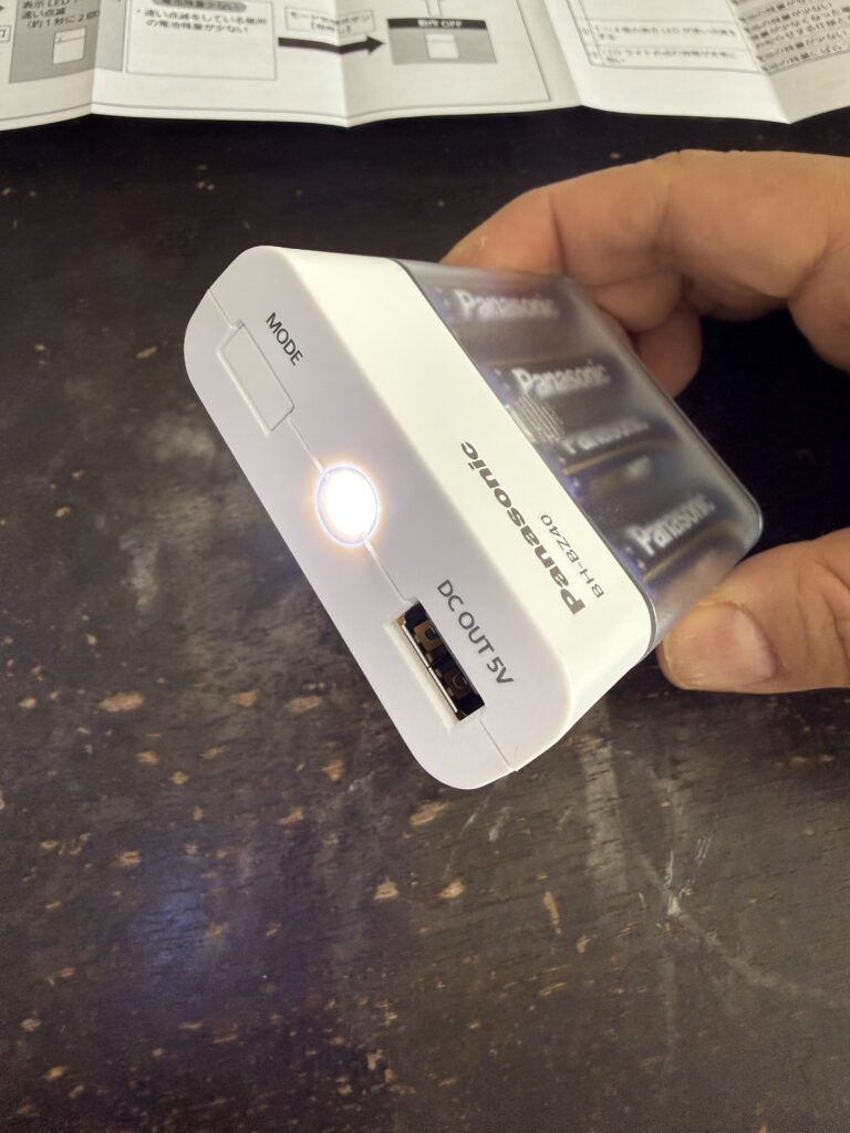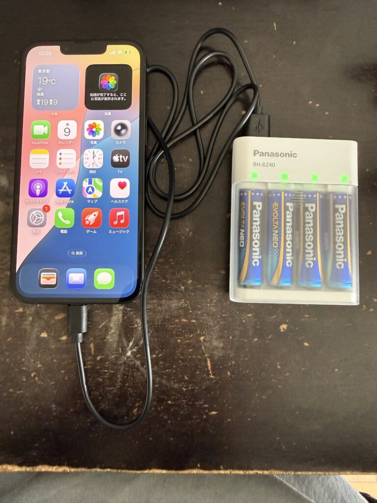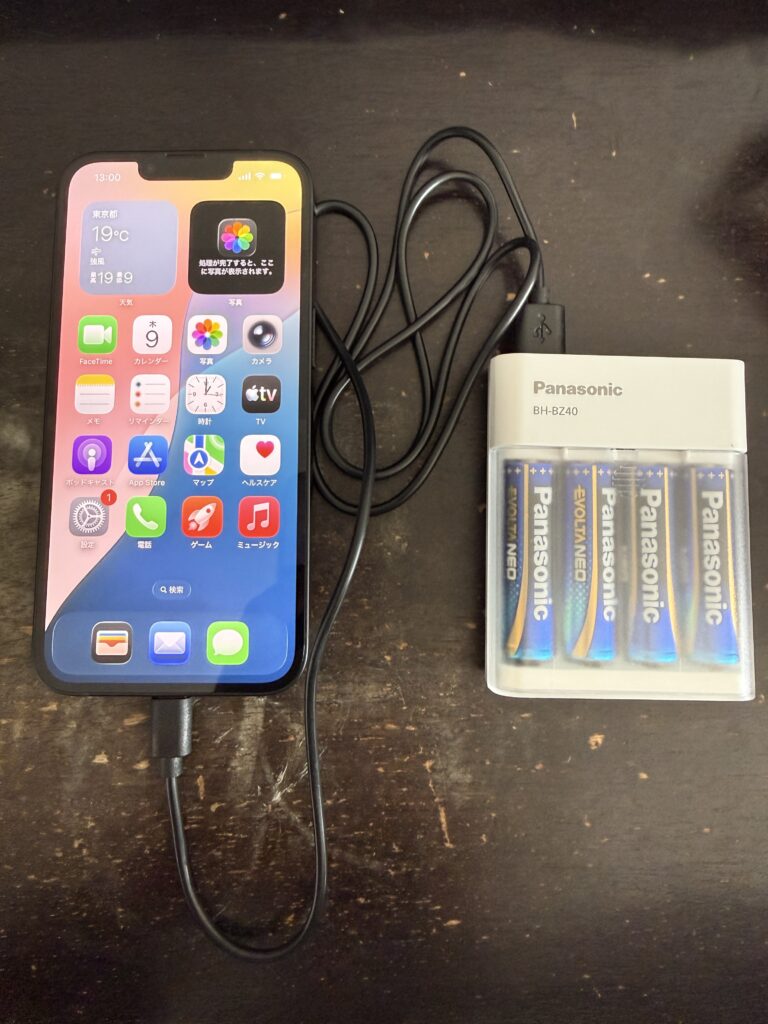 安心のパナソニック製充電器で、単三電池4本でスマートフォンを充電することが可能です。