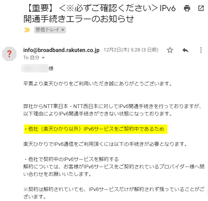 次の日、メールチェックをしていると以下のメールが届いていました。IPv6サービス=IPoE接続のことです。
