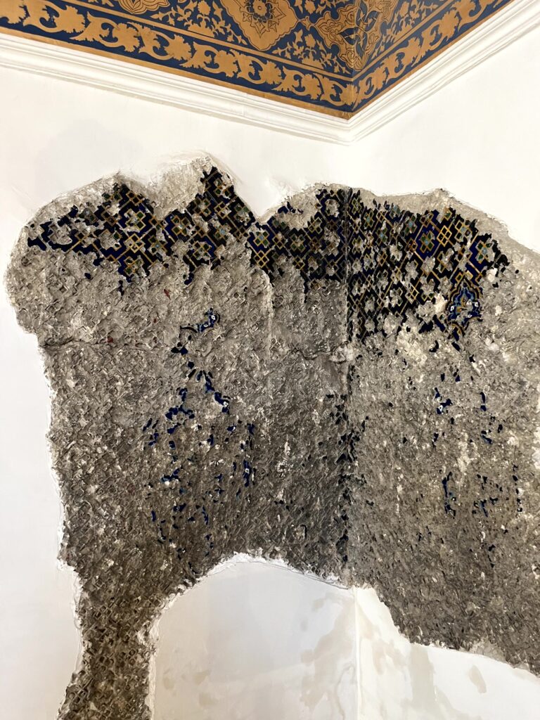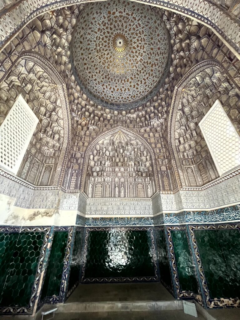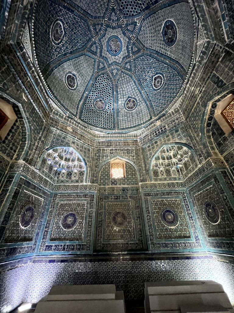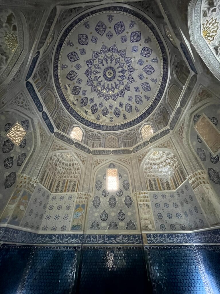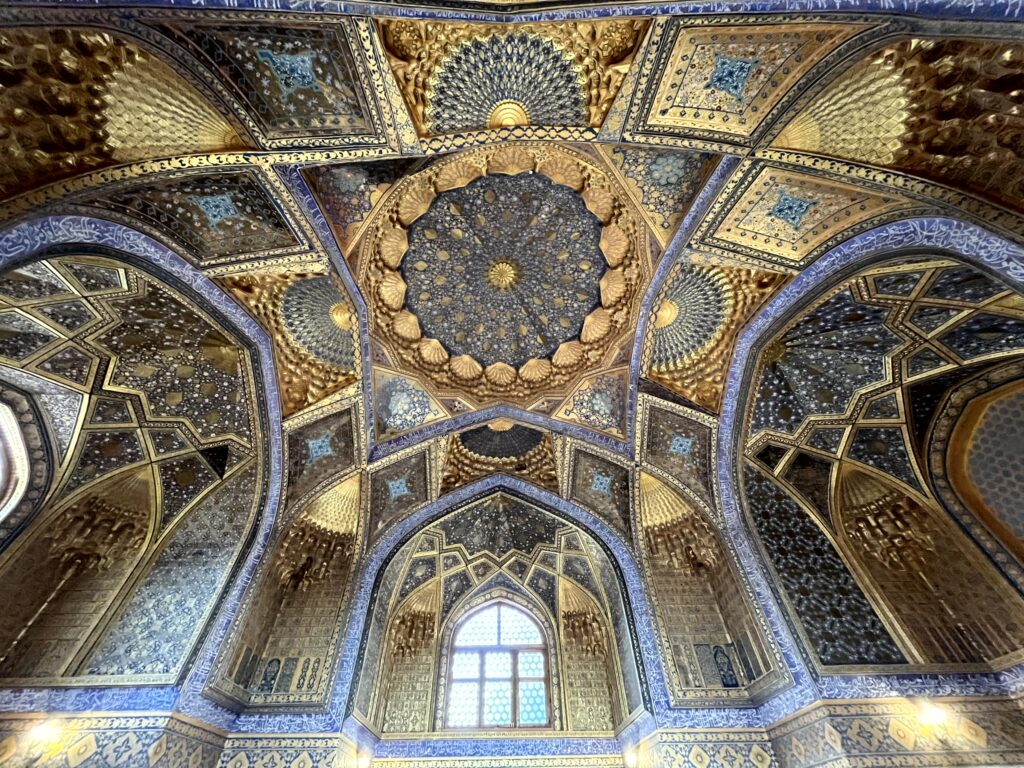 レギスタン広場に比べると建物は小さいんですが、内部に入ると天井の装飾が見事なんです。まるで万華鏡を覗いているかのような、吸い込まれるような美しさでした。