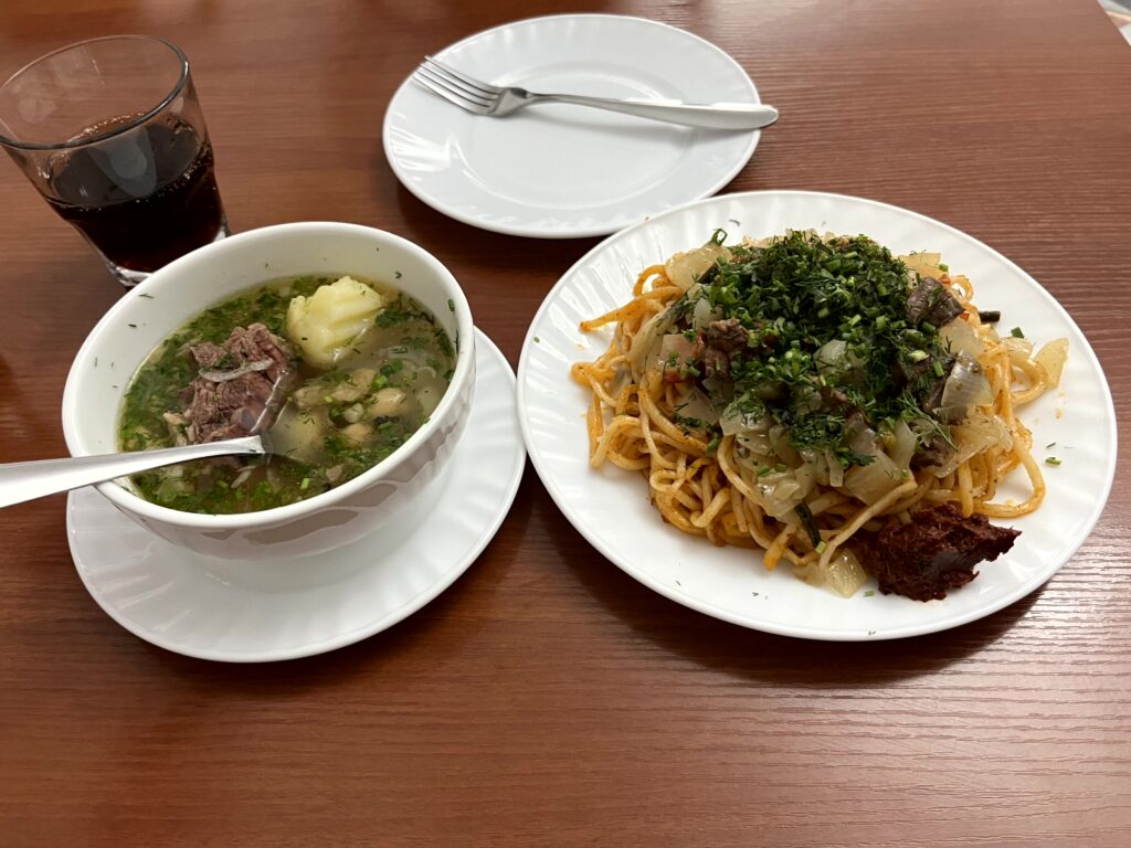 もう一つ、ウズベキスタンの伝統的なスープシュルパも食べてみました。(左のスープ)