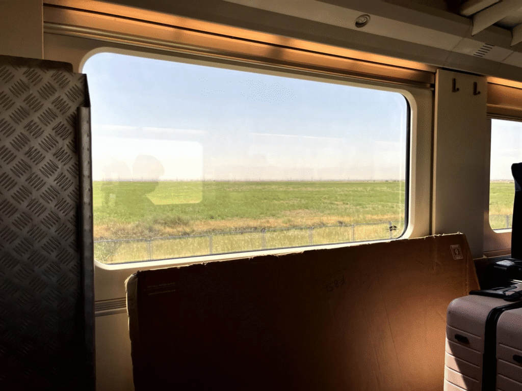 車窓からは、地平線まで広がる広大な草原が見えました。日本の景色とは全然違って、中央アジアに来たんだな~という実感が湧いてきます。