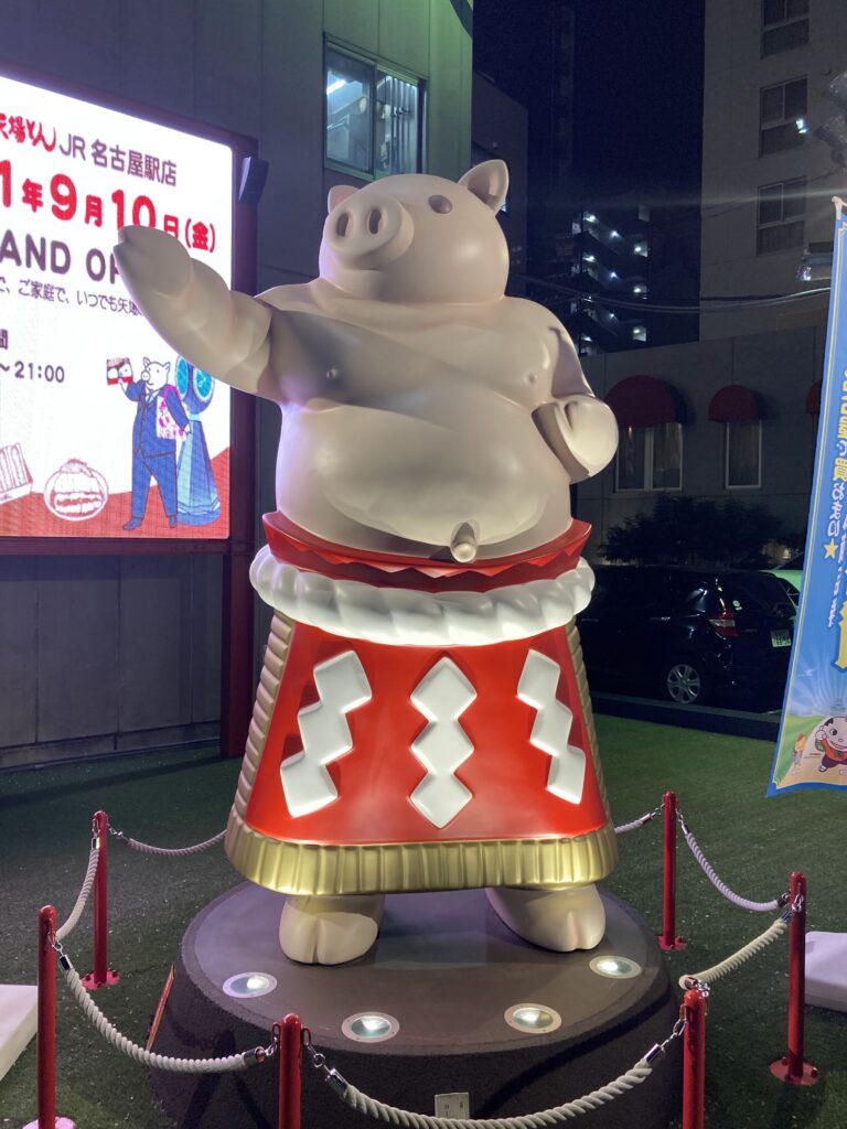 店舗の前にはイメージキャラクターであるぶーちゃんの像が建立されている。